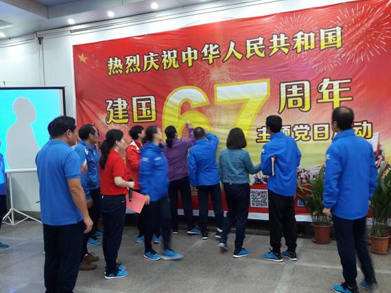 最后,大家纷纷走上主席台,将自己的名字签在舞台横幅“67”二字上,表达了对祖国67年华诞的祝福,主题活动落下帷幕。