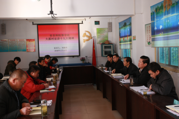 1月11日,院党委书记刘晓洪到宜都市红花套镇大溪村宣讲党的十九大精神,传达中央、省委农村工作会议精神。院党委副书记、纪委书记刘杰主持宣讲会,院办公室、产业处、人事处相关同志,红花套镇党委主要负责人、大溪村村委成员和党员代表参会。