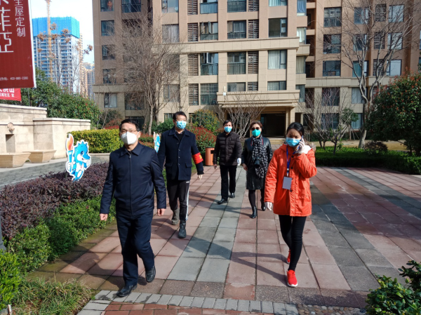 李宗春一行在复地悦城社区党支部书记焦雪姣(右1)陪同下查看社区疫情防控工作情况