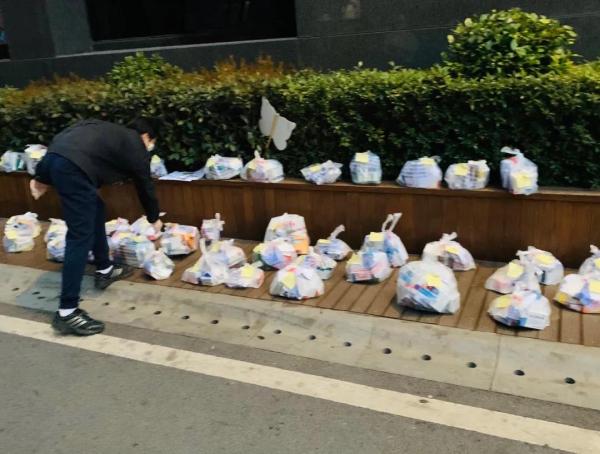回到社区,文斌及志愿者李丹、黄妍君一起逐个电话通知居民到小区门口错峰领取。直到晚上九点,70份药品才全部分发完。