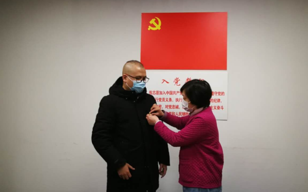 (在入党宣誓仪式上,党总支书记洪燕为冯超佩戴党徽)