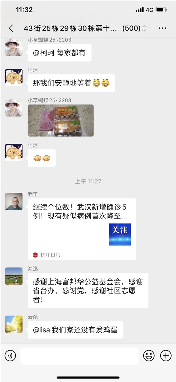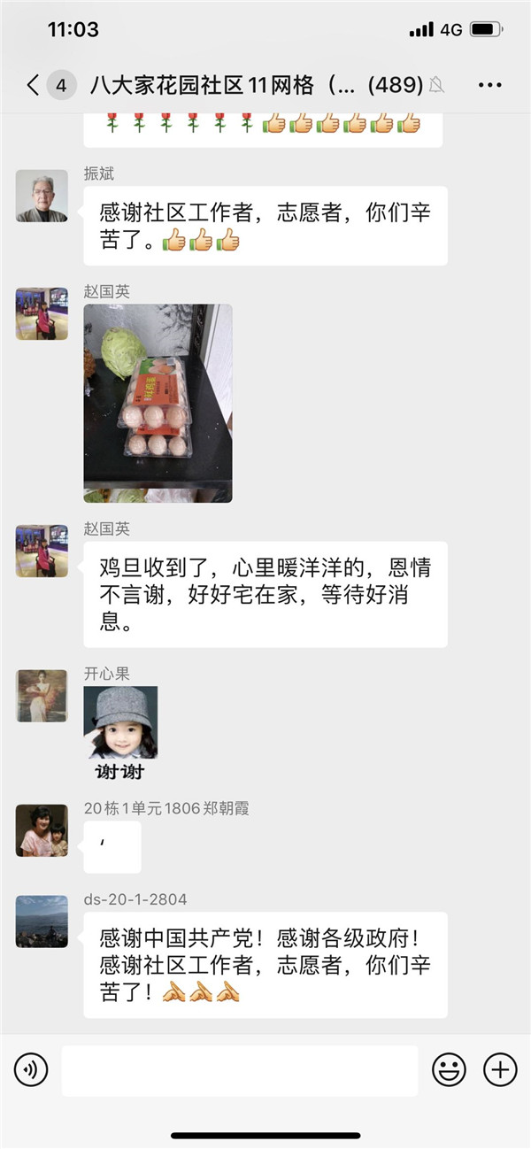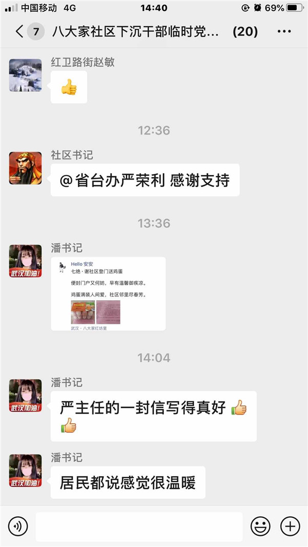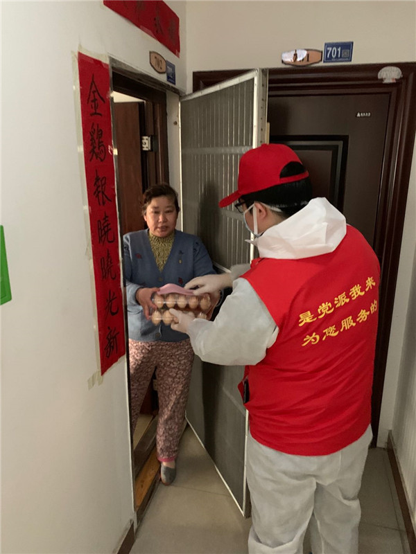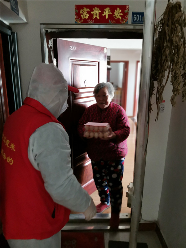 三是服务群众,关爱居民,辛勤付出赢得居民的赞誉。“便封门户又何妨,早有温馨御疾凉;鸡蛋满装人间爱,社区邻里尽春芳”,这是一个社区居民事后发给社区潘书记的微信,信中充满了欢喜与赞誉。在发放过程中,宋琨、王欣每到一户,都仔细询问一下居民生活情况,看他们还有什么需要,并主动带走日常的生活垃圾。有的高龄老人行动不方便,他们将鸡蛋送到桌子上,并叮嘱老人保重身体,随时与工作队保持联系。居民纷纷树起了大拇指。在活动中,居民都很感动,有的要他们坐下休息一会儿,有的送水喝,有的在电梯口帮助接鸡蛋,有的加入一起发放物资。工作队员基本上是2人负责一个单元,大多数楼有三十多层,只有少部分楼二十多层,送完鸡蛋后,每个人内衣基本都湿透了,但大家的心却是暖暖的。这次全覆盖的上门分送,全社区的居民都感受到了组织关怀和爱心关注,同时也收到了“感谢党和政府”“省台办、社区真好”“你们辛苦了”“谢谢你们”感谢语,从居民们的反应看得出他们倍感幸福,在疫情中体会了大家庭的温暖,也激励着我们下沉干部党员更好的为老百姓服务,无愧于“好样的工作队”这一光荣称号。
