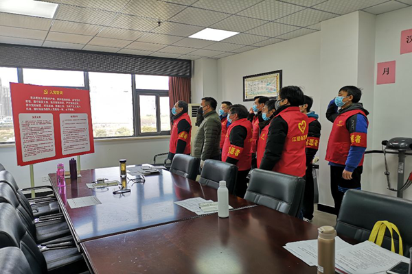 工作组全体党员虽经过一上午的政策宣传、门岗值守、体温监测、巡逻劝导、物资转运配送等任务,不顾疲劳,各位党员佩戴党徽,面向党旗,精神抖擞,坚定地举起右拳,以铮铮誓言共同重温入党誓词。主题党日活动中,周家庆、叶祯祥、王宏涛、肖强、祁炜分别领学了《习近平总书记在统筹推进新冠肺炎疫情防控和经济社会发展工作部署会议上的讲话》、省委和武汉市委组织部的相关文件精神、《武汉市疫情防控指挥部的督查通报》、总队党组会议精神及《总队支援汉博佳园社区工作组工作机制》等。全体党员围绕活动主题,联系工作实际和个人体会进行了交流讨论。