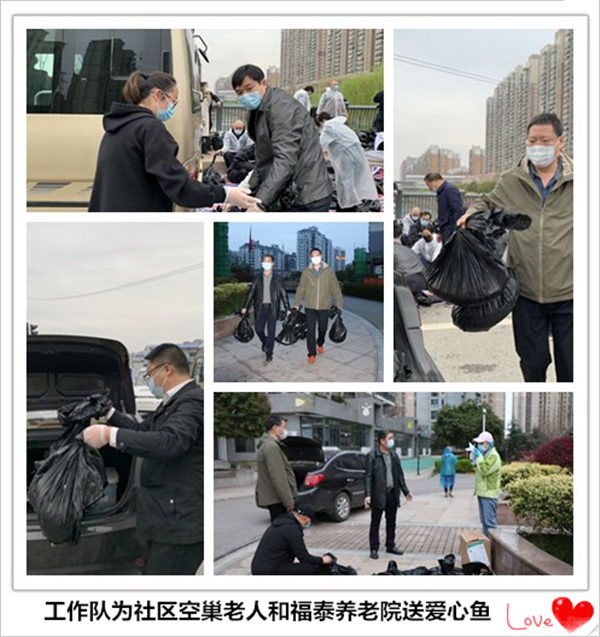 社区所辖福泰养老院生活压力大,工作队自发组成的爱心车队主动承担各类跑腿任务。多次为养老院运送爱心蔬菜、爱心水果、爱心鱼,累计鲜鱼57份、送鸡汤5箱,爱心肉10份……大家用一个个暖心善举给予老人们家人般的关怀。