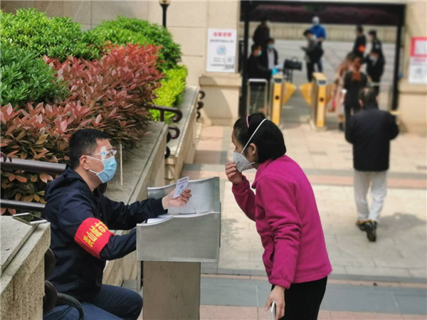4月8日一大早,复地悦城小区二期门口,省档案馆下沉工作人员为出入小区的居民逐一核查登记信息,为外出购物居民发放出入“小卡片”,填上外出时间,进入小区时,再由工作人员填上返回时间。