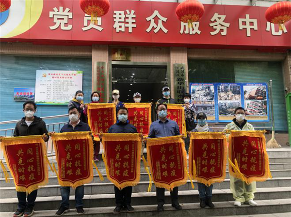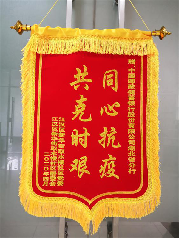 4月10日,江汉区新华路取水楼社区授予邮储银行湖北分行党员突击二队“抗疫”锦旗,表彰其在疫情期间与广大社区居民“同心抗疫、共克时艰”的特殊贡献。