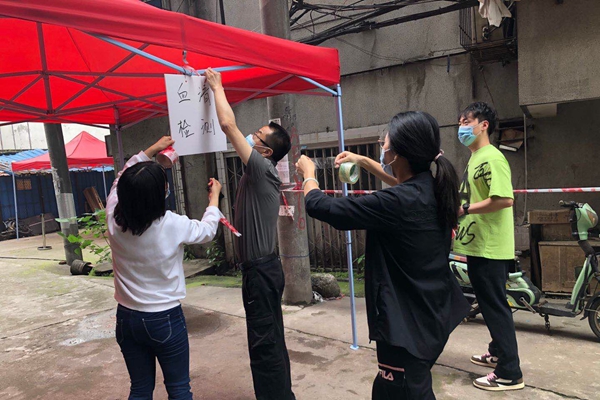检测现场,志愿者同社区工作人员一道布置好场地,胡静负责居民身份信息核对,张云做好登记并发放检测号码凭条,王敬业守好入口为居民测量体温,组织每5人一组进入检测区域,曾照东在区域内维护好秩序,宋兰兰在出口回收第三张凭条,确认每个受测居民都做完核酸检测和血清检测两项检查。他们不断提醒居民保持1米安全间隔,避免交叉感染,确保现场安全有序,大家分工明确却又通力协作。