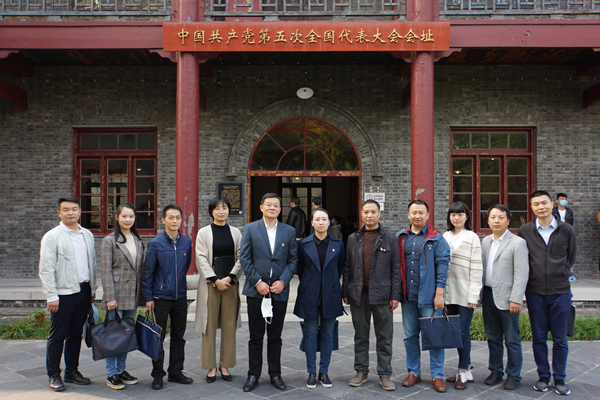 图为电子政务中心党支部、事业处党支部全体党员干部在五大会址前合影