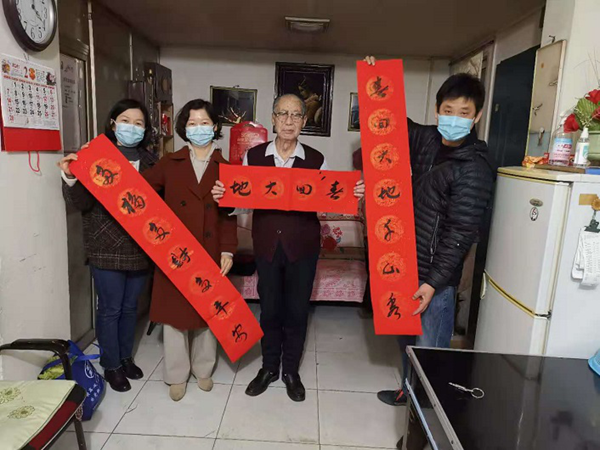 长江局下沉党员和六合社区工作人员一起来到胜利街232号大院空巢老人肖爷爷家,送上喜庆的对联和新鲜的蔬菜。肖爷爷高兴地说:“谢谢你们总来看我,我们一起拍张合影吧,我要把照片发给外地的女儿,让她放心,社区和下沉党员们就像家人一样!”