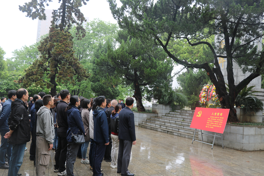 全体党员冒着绵绵细雨拾阶而上,怀着无比崇敬的心情来到施洋烈士纪念碑前肃立,高声齐唱国歌,随后集体向革命烈士默哀并进献花篮,表达对施洋烈士的崇高敬意。全体党员重温入党誓词,表达不忘初心、牢记使命,继承先烈遗志、发扬革命传统,为实现中华民族伟大复兴的中国梦不懈奋斗的坚定信心和决心。在武汉市烈士陵园工作人员深情讲解下,大家一起追忆施洋烈士的英勇事迹,深切缅怀革命先烈的丰功伟绩。随后,全体党员沿着施洋烈士墓绕行一周,鞠躬献花,表达对施洋烈士的深切怀念。