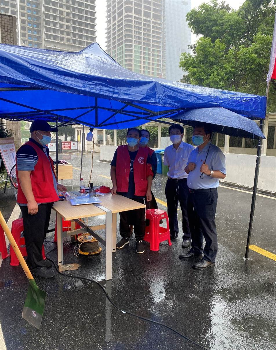 8月13日上午,湖北省委统战部副部长、省社会主义学院党委书记雷邦贵,院党委委员、副院长杨旭东一行人等冒雨前往徐家棚街道惠誉花园社区封控值守点检查指导疫情防控工作,看望慰问奋战在防控一线的下沉党员干部。