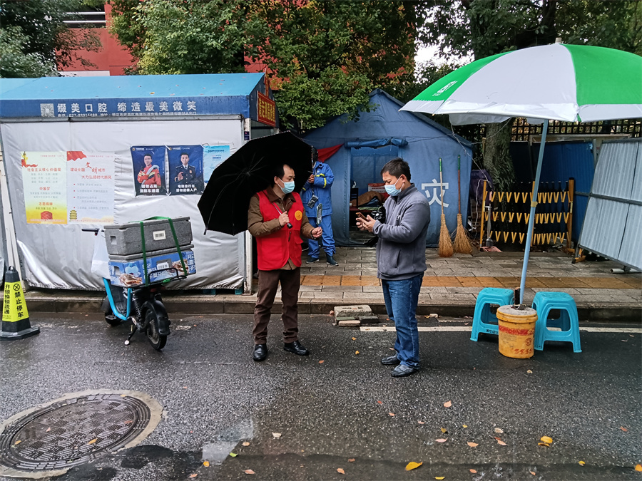 29日下午刮风下雨不停,武汉气温降至个位数。他仍然准时到达卡口穿上红马甲,参与门岗值守,与其他下沉党员一道,为进出居民做好服务工作。在做好扫码工作的同时,引导快递小哥将物资放到指定位置通知居民有序领取。在寒风冷雨中工作虽然不易,但蔡友恒依然执着地坚持。他说,“作为入党积极分子,参与居住地党员下沉工作也体现着省慈善总会形象,要用自己的实际行动学习宣传贯彻党的二十大精神。”