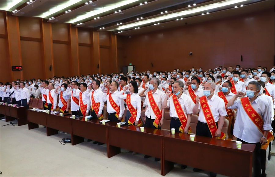 表彰大会开始前,刘荣山带领全体党员重温入党誓词,2023年新发展的预备党员进行入党宣誓。表彰大会在雄壮的国歌声中正式开始。会议宣读了“两优一先”表彰决定,为“光荣在党50年”的老同志代表和受表彰的优秀共产党员、优秀党务工作者、先进基层党组织代表授牌、颁发纪念章,4名先进典型代表分别作了交流发言。