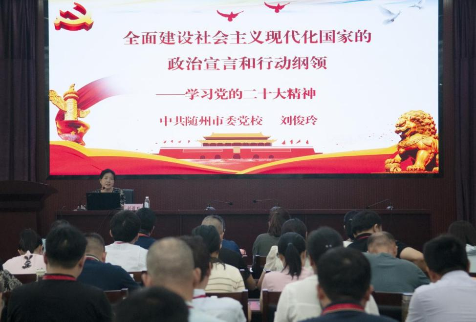 随州市委党校刘俊玲教授围绕党的二十大精神和学习工作实际,结合过去五年工作和新时代十年伟大变革历程,讲述了党的二十大的重大意义和深远影响,深入分析了党和国家事业的新部署、新要求。同时,聚焦建党精神,结合典型事例,教育引导参训学员坚定理想信念,牢记党的宗旨,赓续中国共产党人精神谱系,用精神之火、信念之光激励自己奋勇前行。