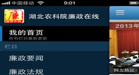 “廉政在线”手机报设有廉政要闻、廉政法规、廉政先锋、警钟长鸣、廉政文化、廉政互动等栏目。“廉政在线”借助先进网络传媒技术,对党风廉政宣传教育方式进行新探索,实现对院党风廉政建设情况的全时空、全方位、全覆盖。这种新颖的方式受到了干部职工的欢迎,目前,广大干部职工正在踊跃下载安装“廉政在线”手机版,全院使用人数将达到700多人。“廉政在线”手机报的开通,将有力推动湖北省农业科学院党风廉政建设跃上新台阶,取得新成效。