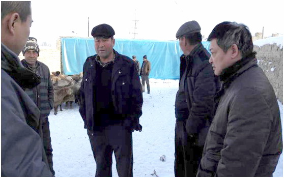 局干部与维族村干部一起到结亲结对牧民家中商讨扶贫帮困之策