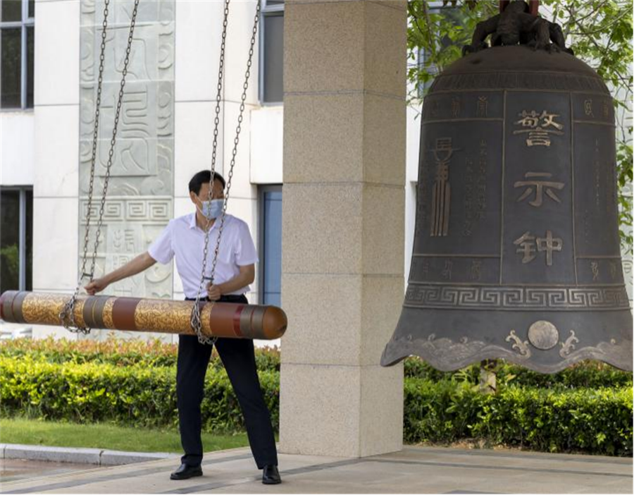 参观完展馆后,青年干部们在警示教育基地广场庄严列队,厅机关党委副书记、机关纪委书记周裕波作为代表敲响了廉政警钟,三下击钟之后,长鸣的钟声回荡在广场上空,发人深思、让人警醒。