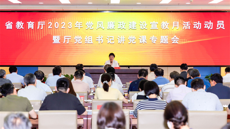 6月21日,省教育厅组织开展2023年党风廉政建设宣教月动员暨厅党组书记讲党课活动,省教育厅党组书记、厅长周静对厅直系统党风廉政建设宣教月活动进行了动员部署,并以《坚持政治统领 加强纪律建设 在教育强省建设中彰显担当作为》为题讲党课。