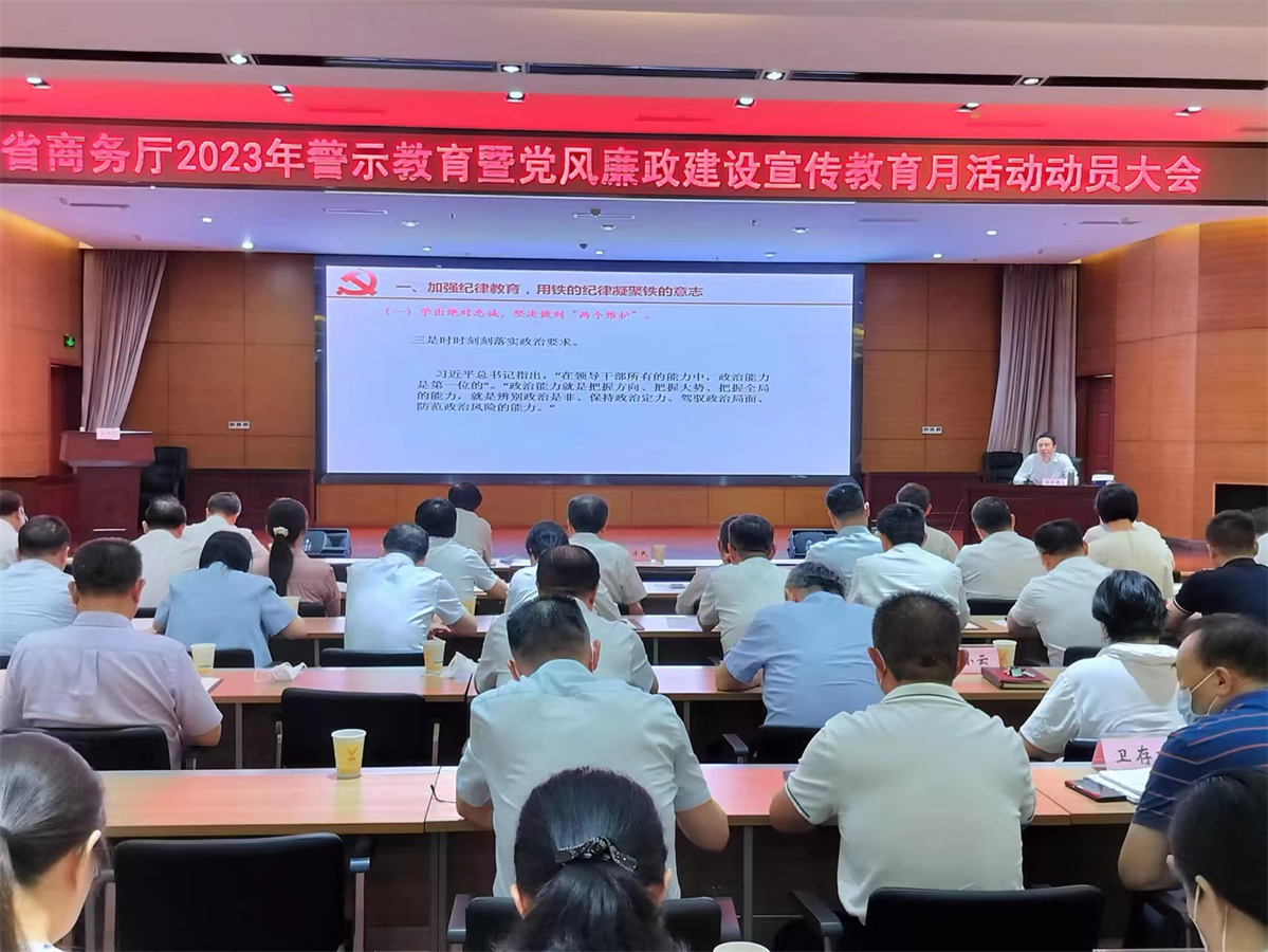 6月30日,省商务厅组织召开2023年警示教育暨党风廉政建设宣传教育月活动动员大会。厅党组书记、厅长王济民为党员干部讲廉政党课并动员部署党风廉政建设宣教月活动。厅党组成员、副厅长余学武主持会议并宣读《2023年省商务厅党风廉政建设宣传教育月活动实施方案》。