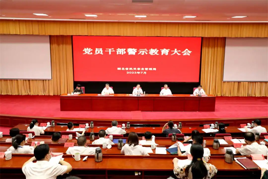 7月5日,为深入推进学习贯彻习近平新时代中国特色社会主义思想主题教育走深走实,认真落实全省领导干部警示教育大会精神,按照第24个党风廉政建设宣教月活动安排,省机关事务局在洪山礼堂召开党员干部警示教育大会,集中组织观看警示教育片《镜鉴家风》《剑指顽疾 砸局破圈》。局党组书记、局长管俊以《加强纪律建设 锻造新时代忠诚干净担当干部队伍》为题讲授廉政党课。局领导李志启、戴峰出席会议,局党组成员、副局长杨文军主持会议。
