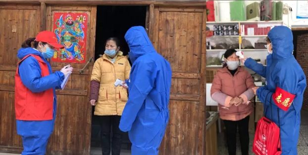 在新洲,青年志愿者上门为辖区居民测量体温,运送物资。