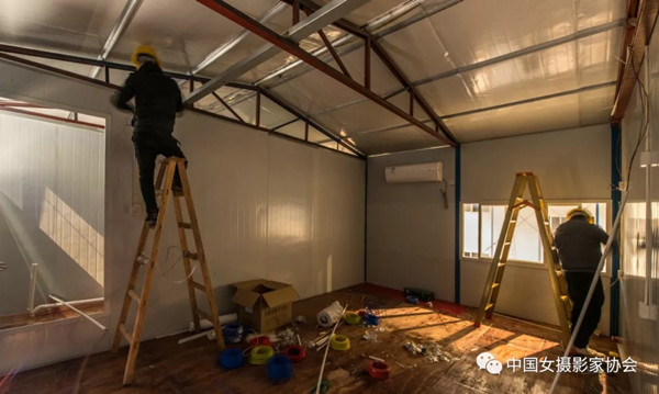 2月1日,大年初八,雷神山医院医护人员生活区主体结构全部完成,工人们正在进行内部安装。黄蕾摄影