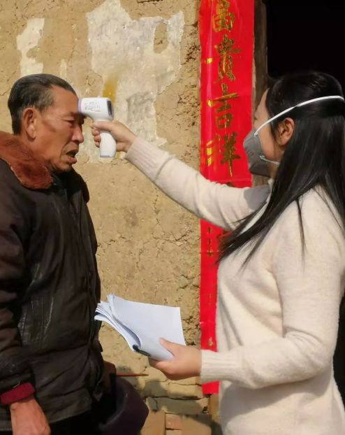 谷城南河镇熊湾村妇联主席邱世香为武汉返乡人员监测体温