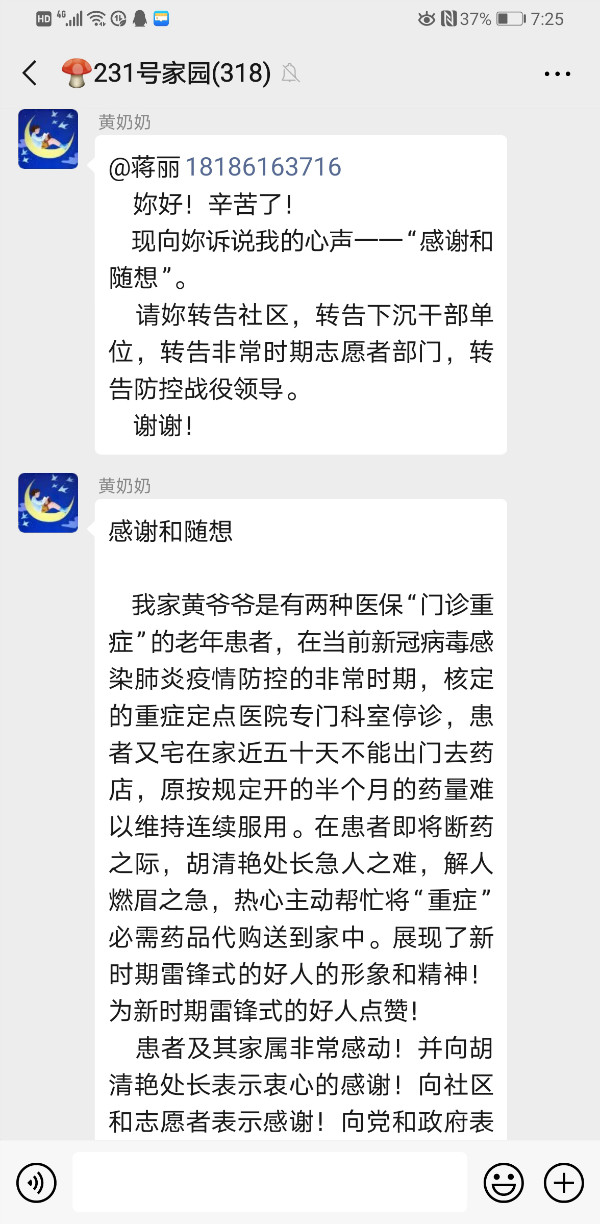 教育处多名女党员全部下沉所在社区,刘缅是局里的双职工,孩子正处于高考冲刺的关键时期。丈夫邓煜是党员工作队的成员,承担了下沉白云社区的工作,同时还参加了姚家岭社区的夜班值守,刘缅本人也长期患有肺部疾病,动作稍大一点就会喘粗气。但接到社区工作任务后她丝毫没有推诿退缩,咬牙克服病痛和困难,为居民联系车辆、搬运物资和药品并准确无误地发放到她们手中。何璇是两个孩子的母亲,她的爱人去年做了肺部三分之一切除手术尚在恢复期,目前她家中只有她一个劳动力,但当收到下党员社区通知时,她第一时间向社区报到,毫无怨言连续奋战在社区防疫一线。她每天穿梭于照顾家人和社区志愿者活动中,除了常规值守管控外,还积极指导本单元年纪较大的业主操作手机团购、分发物资和为空穴老人送菜等工作,帮确诊邻居联系生活事宜等。