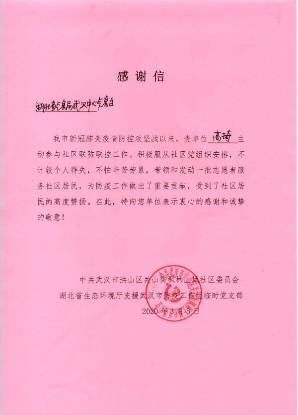 由于她出色的表现,关山街枫林上城社区和湖北省生态环境厅支援武汉市防疫工作组临时党支部特地发来了感谢信。她说“这是鼓励也是鞭策,我一定要想方设法解决好社区居民的诉求,传递正能量!”