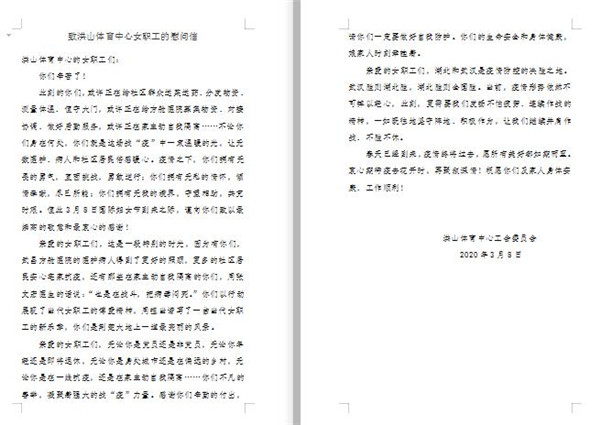 3月8日一大早,中心工会女工委员就在群内发出《致洪山体育中心女职工的慰问信》电子版,向广大女职工送来节日的慰问。