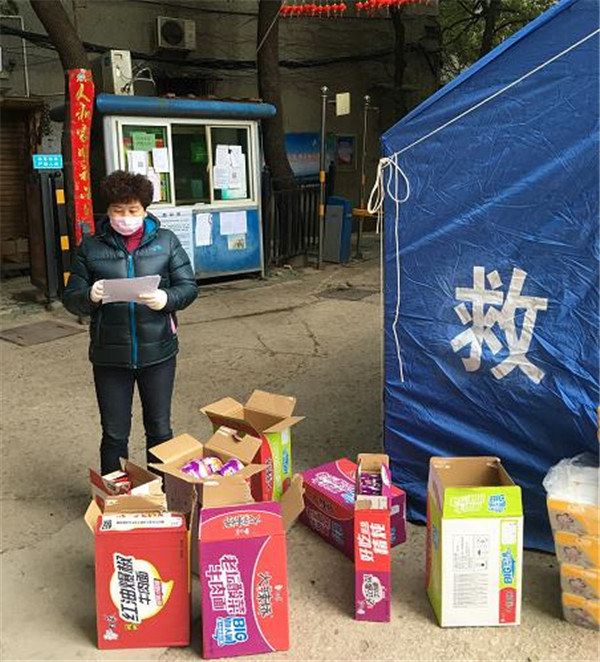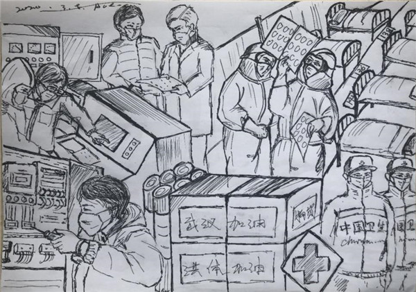 (袁君绘制的洪山中心转交捐赠物资给方舱医院)