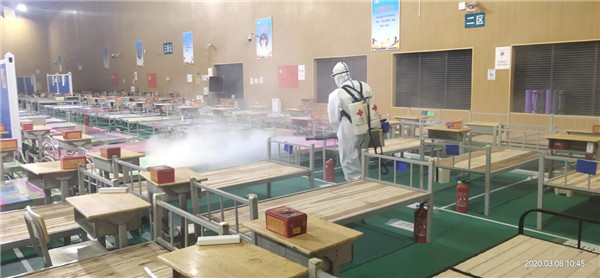 3月8日,洪山中心对武昌方舱医院已经闭舱的污染区进行消杀,在中心主任冯金荣、副主任张巍的带领下,邵俊、王美萍、胡晓敏、王慧等女同志依然坚守在现场,配合物业保卫人员和中国红十字会派来的专业消杀人员,全程参与消杀工作。