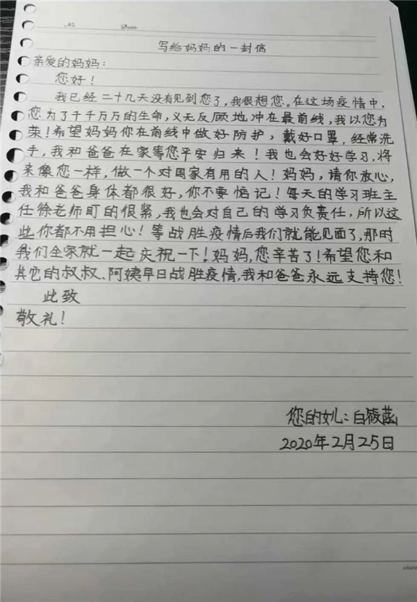 奥体分校四年级乒乓球运动员白筱菡给护士妈妈的一封信