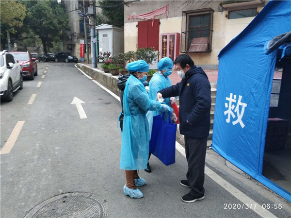 作为土生土长的武汉人,投入疫情防控战斗,我责无旁贷。疫情防控之初,我参与社会捐赠专班整理相关数据,后来又参加社会稳定专班值班值守。2月18日,我和厅机关3名党员周玮、朱亮、朱亚作为厅机关首批下沉社区工作队(党员突击队)队员进驻虎泉社区凯乐桂园小区参加一线防疫工作,让我对这场人民战争、总体战、阻击战有了更深刻的感受。记得刚开始的时候,确诊和疑似患者人数不断攀升,若说我们内心没有一丝恐惧那肯定是假话,但是在组织需要我们的时候,我们决不会当逃兵。在社区,重点要做好体温排查、门岗值守、物资采购、送菜送药、困难人员帮扶等工作。我们穿着防护服,戴上口罩、手套和护目镜,冲在一线为有确诊和疑似患者的楼栋运送物资,挨个敲门送菜到户。如此近距离的接触,后来回想起来大家都冷汗直冒。那几天,武汉气温很低,风雨交加,小区门口没有遮挡,我们冷得直哆嗦,不停地原地转圈,实在不行到车里暖和下再出来。遇到不会使用微信和网购的老人,我们上门问清老人所需,把物资或者药品买回来再送上门。通过厅机关线上电话排查和我们线下实地走访,做到了对这个10栋楼、近千人的大型小区住户情况几乎了如指掌,哪一家只有老人居住、哪一家有什么需求,一清二楚。