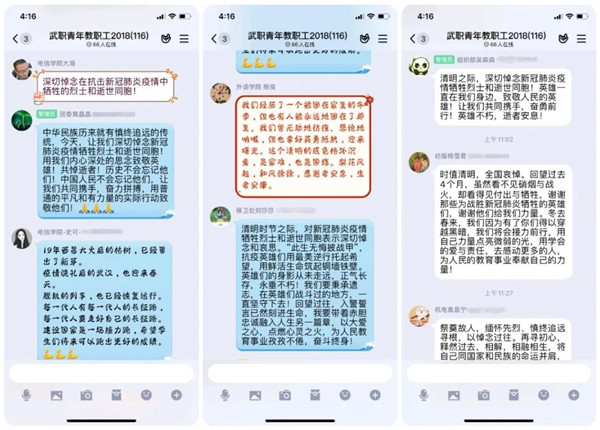 为表达对全国各族人民对抗击新冠肺炎疫情斗争牺牲的烈士和逝世同胞的深切哀悼,国务院在4月4日举行了全国性哀悼活动。上午10时,防空警报鸣响,武职青年师生和全国人民一道就地向新冠肺炎疫情牺牲烈士和逝世同胞默哀3分钟。随后,校团委通过网络召开纪念和哀悼抗击新冠肺炎疫情斗争牺牲烈士和逝世同胞的“云追思”会,全校青年师生代表400余人参加活动,在云端缅怀英雄、哀悼逝者,更立足当下,展望未来。