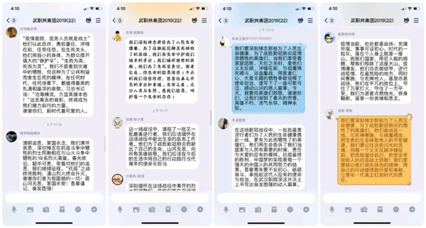 外语外贸学院分团委书记、辅导员雷丽说,在这场新冠战役中,一批批最美“逆行者”为了人民的生命健康勇赴一线,更有为此而牺牲了的英雄们,他们用生命告诉我们:当国家与人民有需要的时候,责任与大爱的应有的模样。抗疫最终的胜利、中国梦的实现是每一个强大的中国人的共同努力的结果。吾辈青年要不忘初心,砥砺奋斗,在职业教育这片沃土深耕教书育人的动人篇章。