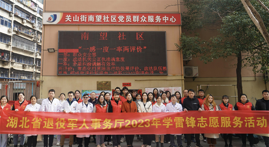 为进一步弘扬雷锋精神和“奉献、友爱、互助、进步”的志愿服务精神,倡导社会文明新风,近日,省退役军人事务厅党组成员、副厅长邹均享亲自带队,携厅直属事业单位湖北省荣军医院医护人员和厅直系统团员青年组成的志愿服务队来到洪山区关山街道南望社区,开展“学雷锋 送健康 送爱心”大型义诊活动。