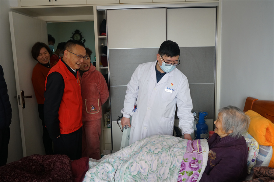 邹均享身着“红马甲”与志愿者一同为社区居民分发免费家庭常用药品和鸡蛋等营养品,亲自上门看望社区几位高龄老人,送上慰问礼盒,并亲切询问他们的身体及生活状况,与老人们深入谈心,了解他们的所思、所想、所盼。