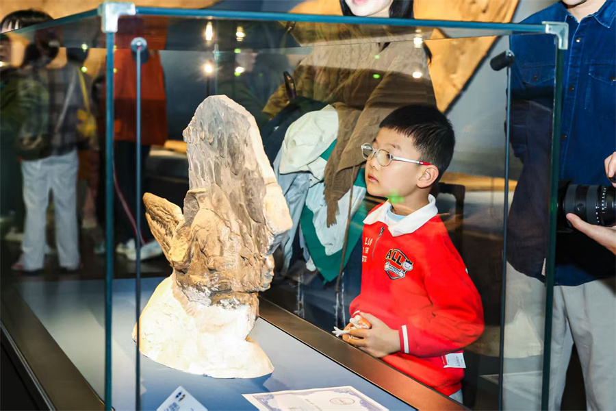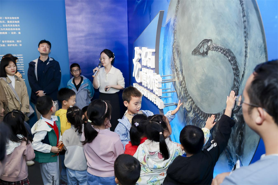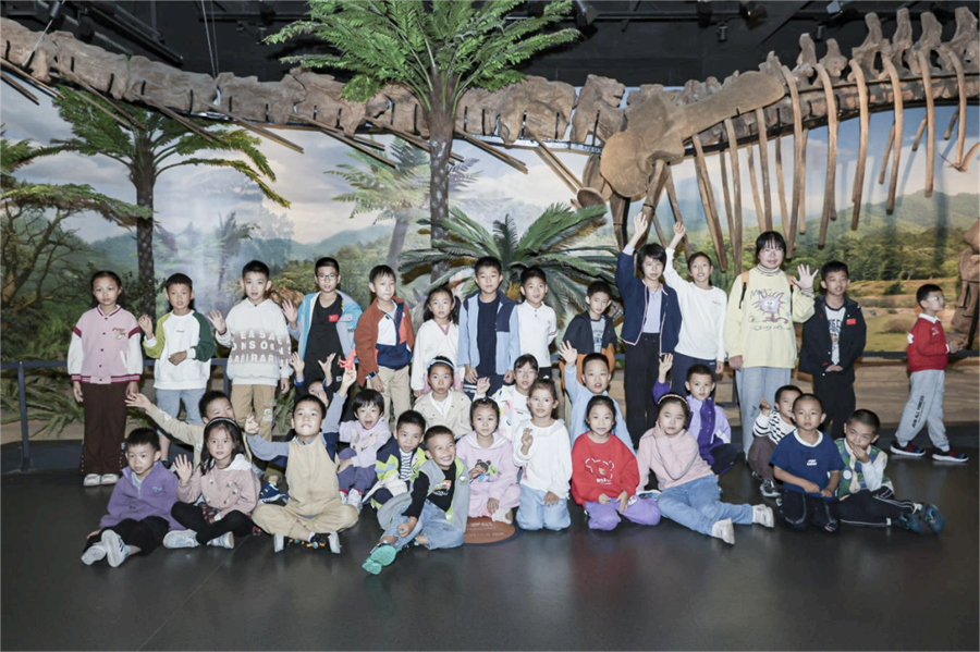 活动设置了两个特色环节。在参观环节,参与家庭在博物馆讲解员的引导下,有序参观“地球起源与生命演化”“海生爬行动物”及“恐龙世界”等主题展区。展厅内陈列的距今约2.5亿至2.0亿年三叠纪时期的海生爬行动物化石、大型海百合等珍贵标本,系统展现了地球生命演化的壮阔历程。孩子们在聆听讲解的同时,积极提问,表现出对古生物知识的浓厚兴趣。