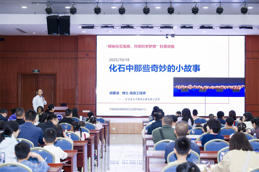 科普大讲堂环节中,武汉地质调查中心阎春波博士结合影视作品中的化石元素,将深奥的古生物演化知识转化为生动有趣的科普内容。讲座过程中穿插6轮有奖问答,孩子们踊跃参与,在互动中巩固了所学知识,现场气氛活跃。