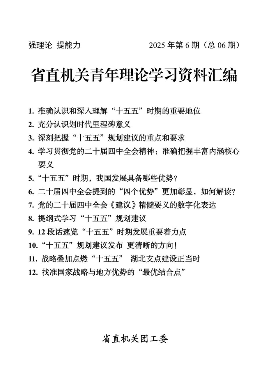 【编者按】为进一步加强机关青年干部理论武装,省直机关团工委定期编制省直机关青年理论学习资料汇编。学习资料包括习近平总书记最新重要讲话和重要指示批示精神、理论文章选读、时事评论、调研与写作方法、党建党史知识等内容,为机关团青组织开展理论学习提供内容,帮助机关青年学好理论、讲好理论、用好理论。《省直机关青年理论学习资料汇编第6期》内容主要聚焦党的二十届四中全会精神解读、“十五五”时期国家发展战略的重要文章和专家学者的相关解读,供各单位团青组织学习参考。