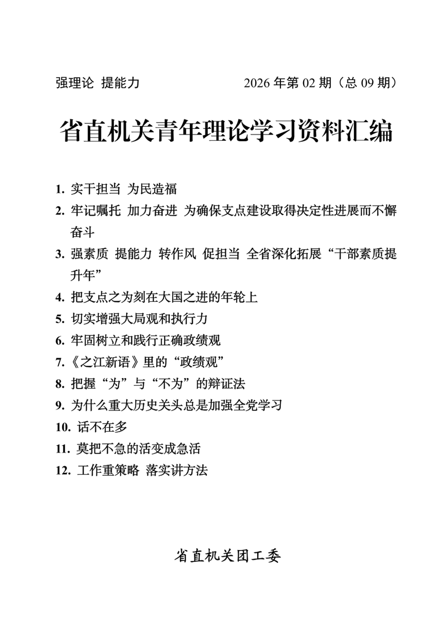 【编者按】为进一步加强机关青年干部理论武装,省直机关团工委定期编制省直机关青年理论学习资料汇编。学习资料包括习近平总书记最新重要讲话和重要指示批示精神、理论文章选读、时事评论、调研与写作方法、党建党史知识等内容,为机关团青组织开展理论学习提供内容,帮助机关青年学好理论、讲好理论、用好理论。《省直机关青年理论学习资料汇编第9期》主要聚焦党员干部如何树立和践行正确政绩观、全省加快建成中部地区崛起的重要战略支点推进大会精神的相关解读以及机关工作经验文章等,供各单位团青组织学习参考。