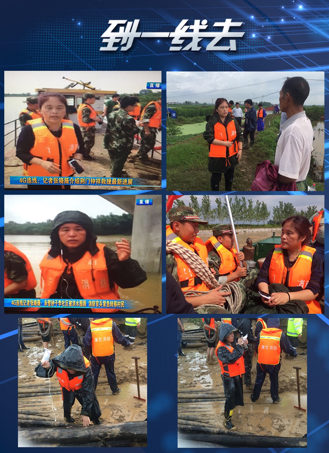 从去年的“东方之星”搜救现场几天几夜不眠不休发回无数救援核心现场报道,到今年防汛一线,站在一个又一个溃堤、漫堤、散浸、管涌现场进行直播连线、发回新闻报道,已经五十岁的女记者张晓薇每逢重大事件都冲在最前线!她的报道足迹遍布建始、荆门、黄陂、钟祥、鄂州、赤壁、浠水、大冶等多个危险地点!在前往建始的路上,她和同事目击了身后十几米远出现的泥石流,一边避让着从山上滚落的石块,一边冒着瓢泼大雨赶往建始抢险的现场。在钟祥长滩镇,为将灾情更加全面的呈现给观众,她站在溃口边上带来现场直播,而直播结束后仅几分钟,原本20米宽的溃口迅速扩展到80米,如果当时直播还在进行中,后果将不堪设想。张晓薇说,“能活着回来真是侥幸逃生,不过当时看到在滑波现场,一些挖掘机械就在现场施工,时常都有滑坡险情,路政工作人员都没有说退缩,我们还有什么理由惧怕;在麻城举水河大桥,出现大面积滑坡,路面被洪水冲出5米深的大坑,武警战士冲锋在现场,六个小时将滑坡险情控制,我们还有什么理由退缩;在蕲春张塝,镇委书记带领党员干部冲在一线,寻找被洪水冲走的亲人,我们还有什么理由不冲在一线……我是一名记者,也是一名党员,冲锋在前,报道一手的现场是我的责任,也是我的使命,更是我的荣誉。”此次报道中,她发掘的人物典型王明华曾经救过小江珊,这次又在洪流中救下挂在树上的小孩和战友;她记录下封堵溃口的消防官兵跳进每秒2米流速的洪水中,游到20多米的对岸牵起救命绳;她用手机拍下了19岁小战士在转移被困群众时、怀抱出生十几天小婴儿的温柔;她记录下一个120斤瘦小战士稳稳横抱即将临盆孕妇妥妥送上冲锋舟。她的勇敢、坚守和温柔让她的新闻都是那么正能量!