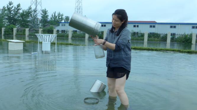 图为7月6日下午16时廖蕾艳在收集雨量筒中的降水