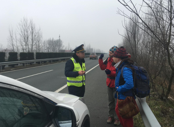 2月4日,两名来自乌克兰的外国“背包客”在高速上拦车,湖北随岳高速路政一大队巡查人员发现后及时将两人带至服务区,问明情况后,为其指明路线,帮助他们离开。