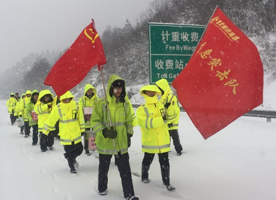 1月4日,大雪纷纷,随岳北段积雪厚度已达65公分,普通车辆已无法正常行驶,随岳高速随岳向k2+200处发生近2公里的车辆滞留。为了让滞留司乘人员不挨饿、不受冻,上午9时,淮河总支组成15人的张兵应急突击队,手抬热汤面、热水,肩抗面包等速食徒步"行军"前往近3公里外的被困路段,为滞留人员送去温暖。随县、京山、宋河、三阳等收费站所纷纷在现场搭建起便民服务台、集中供暖地和司机驿站,免费供应开水、方便面、瘦肉粥、肉丝面和维修工具等。还对老弱病残司乘提供免费餐饮和住宿服务,让滞留人员感受到高速人温馨服务。