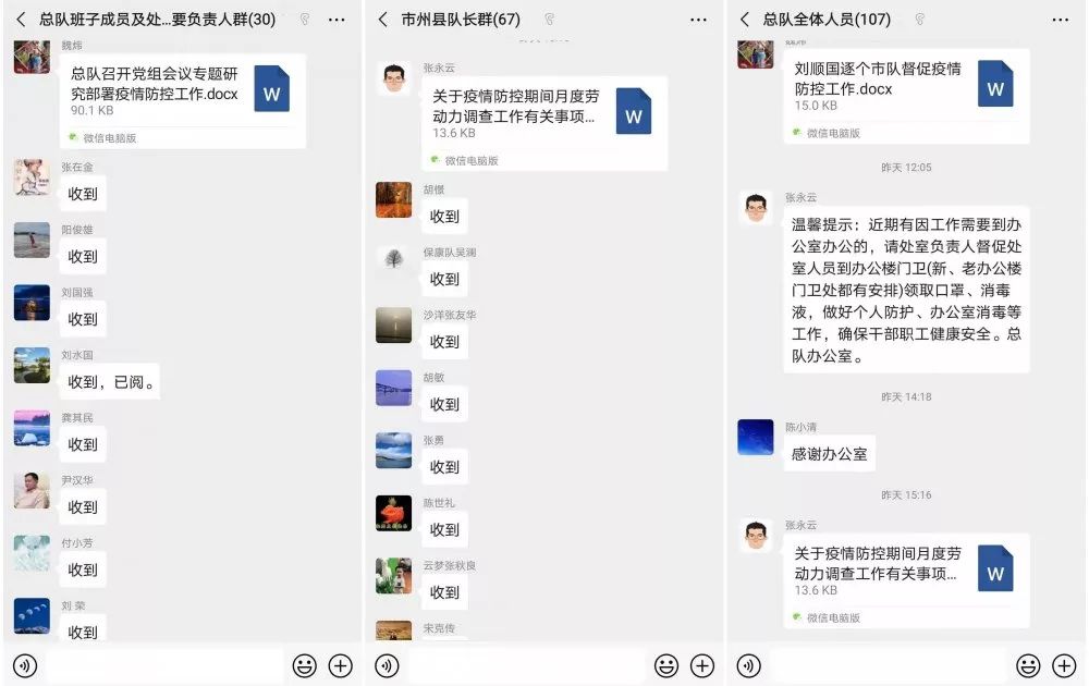为推动系统应对疫情工作更加有效,总队办公室建立了“总队班子成员与处室主要负责人”、“市州县队主要负责人” 、“总队全体人员”三个微信群,仅用于工作交流。