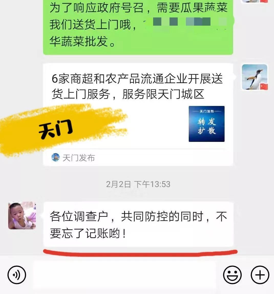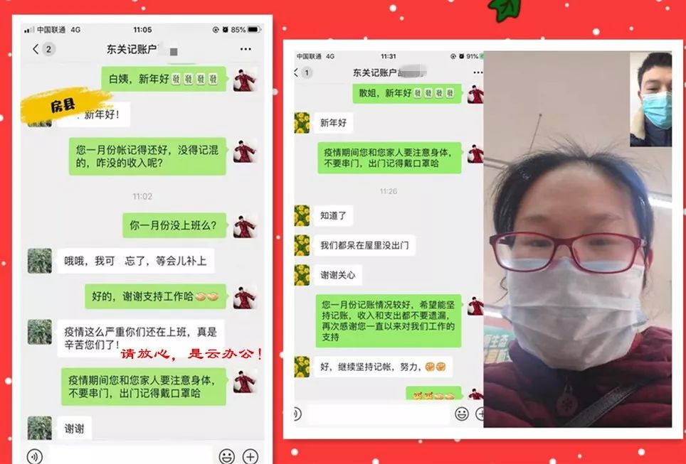 天门、神农架、房县等市县调查队“在线”提醒记账户如实记账,记准记全,确保记账质量。同时,调查队员们还对记账户进行了“云问候”,并主动进行疫情防控宣传,提醒记账户加强防范意识,不串门,不聚会,堵住源头,避免交叉感染。