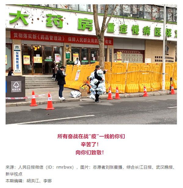 2月4日,看到省委号召党员下沉社区参与疫情防控工作,我第一时间向江岸区惠民苑社区报到,接受社区安排分工,成为一名社区志愿者。武汉三天拉网式大排查期间,为了摸清社区疫情底数,我一天打数百个电话询问居民体温情况,电话打不通就上门查看,确保“不落一户、不漏一人”。排查结束后,我承担为社区居民解决生活难题,团购买菜、代购药物等工作。2月24日,我与惠民苑社区网格员丰枫一行去药房为社区90余名重症病人代购药物。我们从早上8点开始办卡、开药、划价、取药、分装,全套流程下来,忙到了下午5点。返程等车的时候,我随手拍下丰枫将药袋挂在身上的照片,并分享到了社区志愿者微信群。很快,这张照片走红网络,人民日报等媒体纷纷报道,丰枫被媒体称为“药袋哥”,被网友称为英雄城市里的平凡英雄。我相信,有全国各地支援武汉的医护人员,有像“药袋哥”一样坚守岗位的无数名逆行者,有众志成城的武汉市民,武汉这座英雄的城市虽然生病了,但它一定会好起来的。