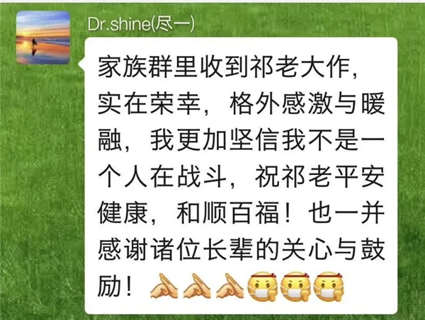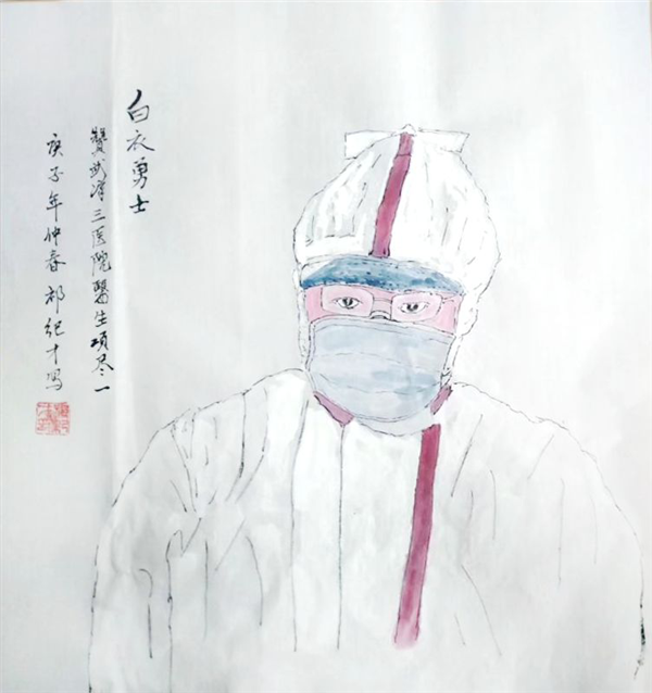 3月2日,当我在粮校校友群中看到原省粮校老同学项经萍的侄儿一一武汉第三医院麻醉医生项尽一的图像在中央电视台新闻联播播出的画面时,我被战斗在第一线、争分夺秒抢救病患的白衣医护人员深深感动了,我连夜创作了一幅三尺斗方的人物画《白衣勇士》,在微信中转发出去,项经萍又连夜转发她项家家族群中,没想我的这一幅画作,得到了身高1米85高个的项尽一医生的好评!也增添了他继续战斗在抗击疫情第一线的信心和力量,他说:“我更加坚信我不是一个人在战斗。”他远在宜昌丹江水利枢纽工程的父亲项经汉、母亲姚玉香三月三日两人联名发来长达近三百字的微信感谢信,说画作中画的儿子眼神特象,说一定要好好作为非常时期的纪念好好保存。